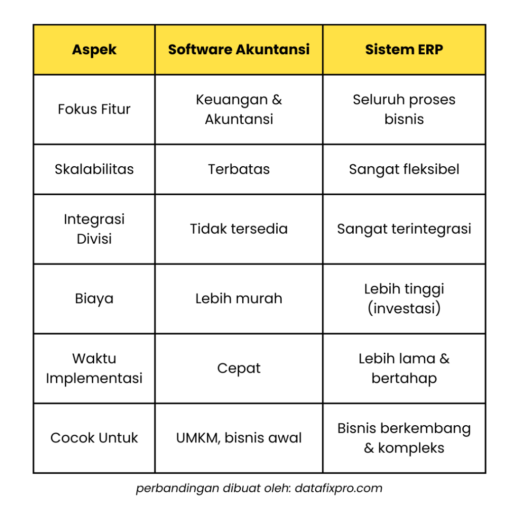 ERP vs Software Akuntansi, mana yang tepat untuk bisnis Anda? Dalam era digital yang serba cepat, pemilik bisnis dihadapkan pada banyak pilihan teknologi untuk mendukung operasional mereka. Salah satu pertanyaan umum yang muncul adalah: Apakah cukup menggunakan software akuntansi, atau sudah saatnya beralih ke sistem ERP? Lantas ERP vs Software Akuntansi lebih bagus yang mana ya? Memahami perbedaan keduanya sangat penting untuk menentukan solusi terbaik bagi pertumbuhan bisnis Anda.
